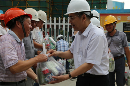 7月31日下午,市建設(shè)局李全明局長(zhǎng)一行,由我公司副總周紅衛(wèi)陪同來我項(xiàng)目金田家園一期工程現(xiàn)場(chǎng)。向在酷暑中堅(jiān)持工作崗位的現(xiàn)場(chǎng)施工人員發(fā)放洗浴用品并表示親切的慰問和真誠(chéng)的感謝。之后詳細(xì)詢問了項(xiàng)目在高溫作業(yè)中采取的安全措施情況。